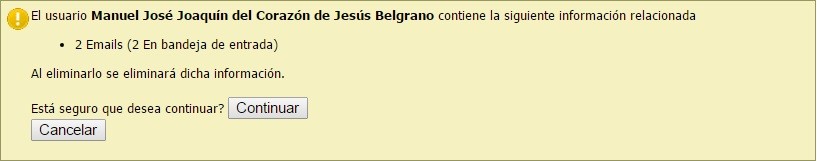 Un mensaje de advertencia nos indicará qué contenidos relacionados con el usuario serán eliminados y de qué grupo. Si estamos de acuerdo, confirmamos la eliminación.
